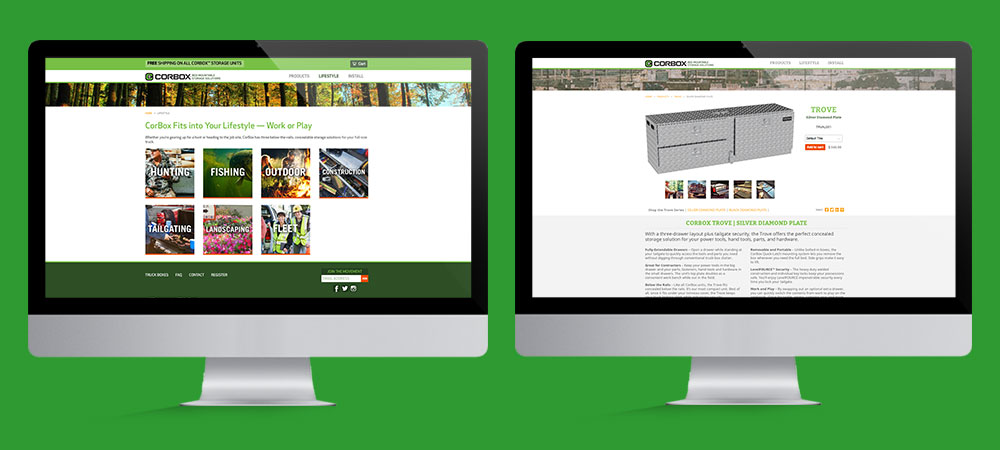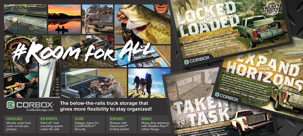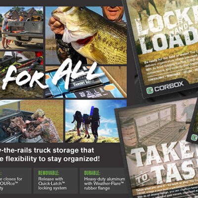 manufactures ‘concealable, organizable, removable’ truck toolboxes – a product segment that’s seen little innovation over the years. DesignCoup created the CorBox products and brand to redefine the toolbox market and target fishermen, hunters, tailgaters, and more to support outdoor and lifestyle storage. The brand included identity development, location video and photography, e-commerce website, packaging, and more.